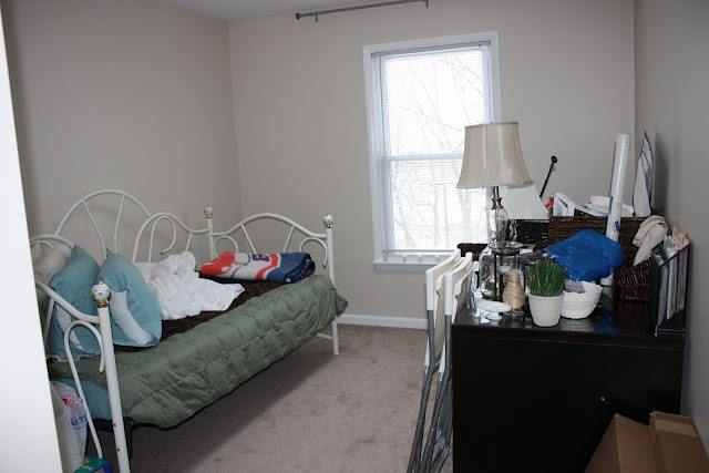 Jordan's dad delivered the crib Saturday morning and we got right to work putting it together. First we needed to clear the desk and junk on top to make room. And by clear the room I mean that we just relocated everything into the guest room:
